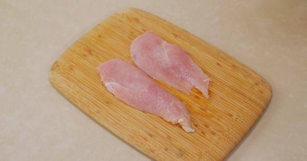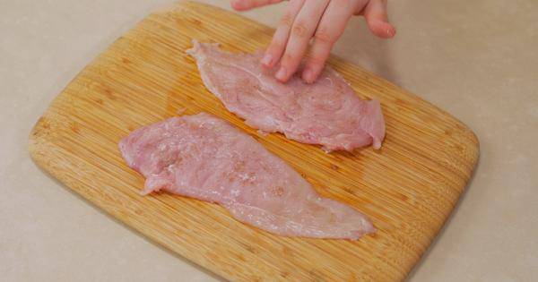 1.فیله‌های سینه مرغ را از طول به دو نیم برش دهید.