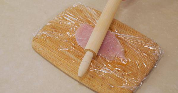 2.برای جلوگیری از پاره شدن، فیله‌ها را با سلفون بپوشانید. با استفاده از چکش یا وزنه گوشت، آنها را بکوبید تا نازک‌تر شوند.