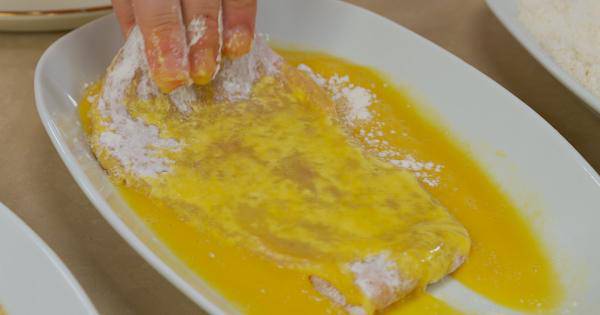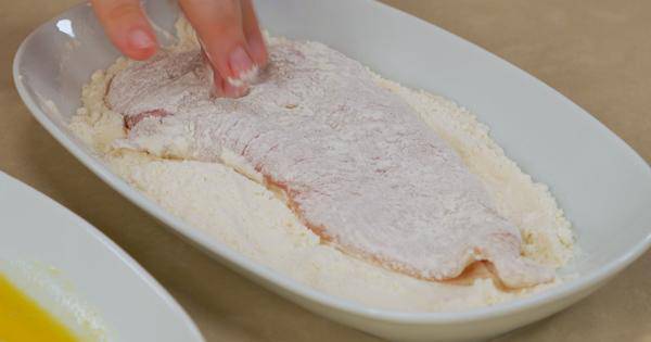 5.آرد و پودر سوخاری را روی یک بشقاب صاف پخش کنید. ابتدا هر دو طرف فیله‌های مرغ نازک برش داده شده را به آرد آغشته کنید. آرد اضافی را بتکانید.